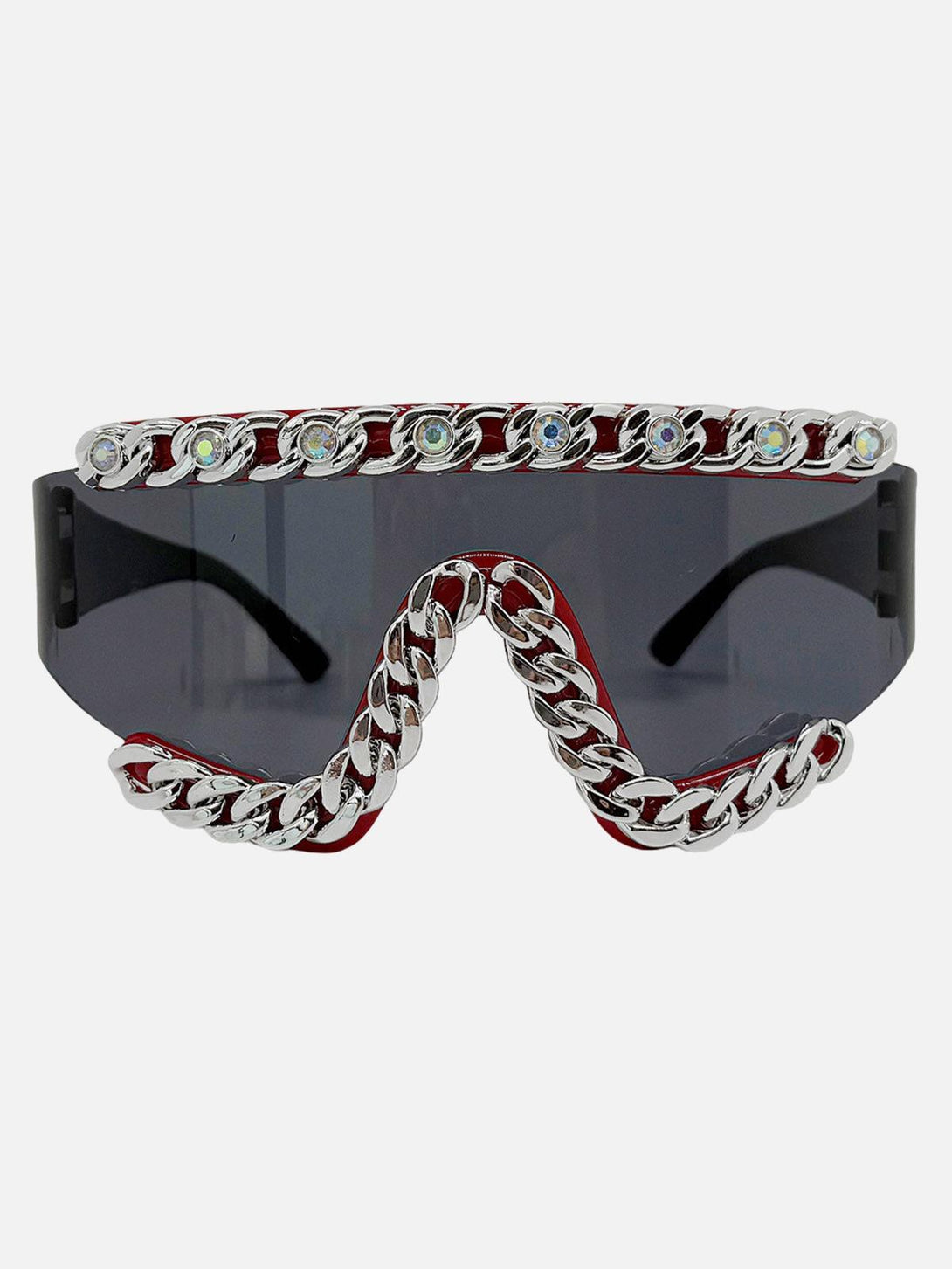 Turn heads on the streets with these audacious sunglasses, where bold chain accents meet sleek, dark lenses for a look that screams urban edge. The intricate chain detailing weaves across the top and sides, giving a futuristic vibe that's perfect for those channeling their inner Y2K aesthetic. Designed in a versatile one-size-fits-all, these shades offer a snug fit that pairs effortlessly with any streetwear fashion ensemble. Whether you're hitting the city or lounging at a rooftop party, these sunglasses are your go-to for injecting some serious attitude into your outfit ideas. Slide them on and let the world see you shine.
